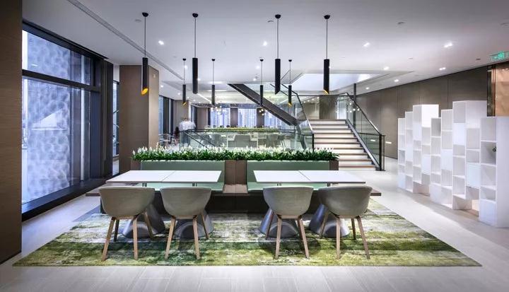 清透的玻璃和充满生机的绿植墙打造的步行楼梯,以此鼓励内部人员的流动。同时周边开放的设计意在创建一种基于动态的工作模式(ABW),通过协作空间将人们聚集在一起。