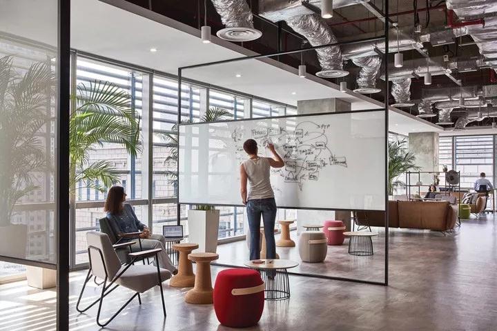 7、可书写表面。可书写表面现在有各种形式和尺寸。现在出现了可轻便移动的书写白板隔断,成为开展头脑风暴和战略研讨会时临时或永久的墙体,这样的设计让空间更具多变性。
