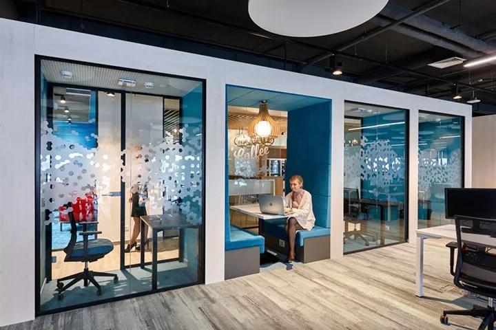 开放空间主要采用开放式框架系统来界定空间区域,这样可以营造开阔的空间感;某些区域,这些分隔系统还兼作临时头脑风暴会议的白板功能。深圳装修公司为了营造一个良好的工作氛围,在工作区引入了吸音板吊顶系统,降低空间噪音。