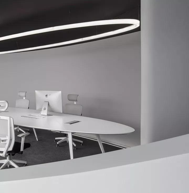 1.首先我们学习宝马的设计思路,让空间的诉求进行重新的结构组配,夸大不太好用的弧形空间,使用它本来就有的特点来营造会议和讨论区。用相对平直的空间来切分一些必须的深圳办公室装修设计。