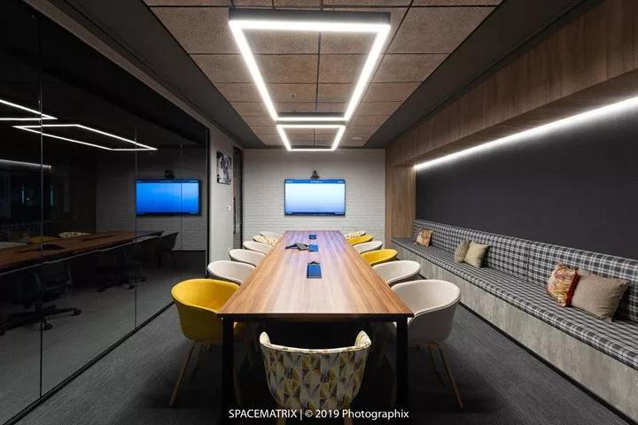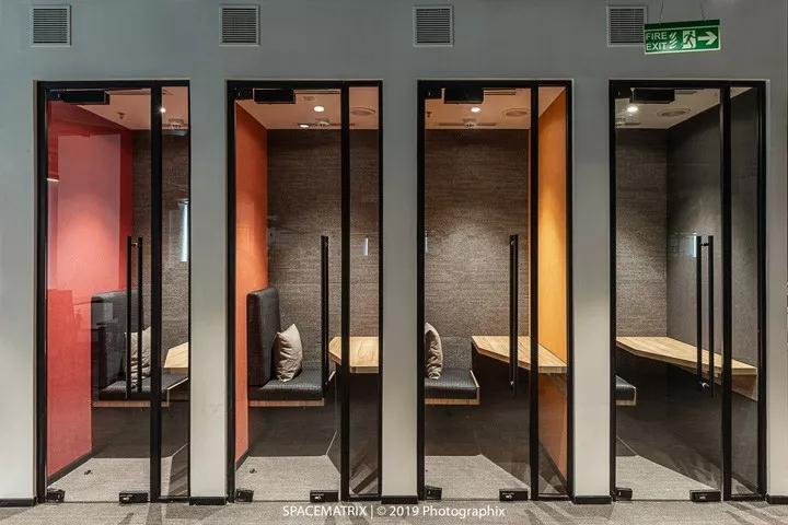 在熟悉了员工的工作方式后,装修设计团队将六种不同形式的会议空间纳入到本案的设计中:电话亭、车厢座会议舱、阶梯座位、头脑风暴区和非正式/正式会议区。