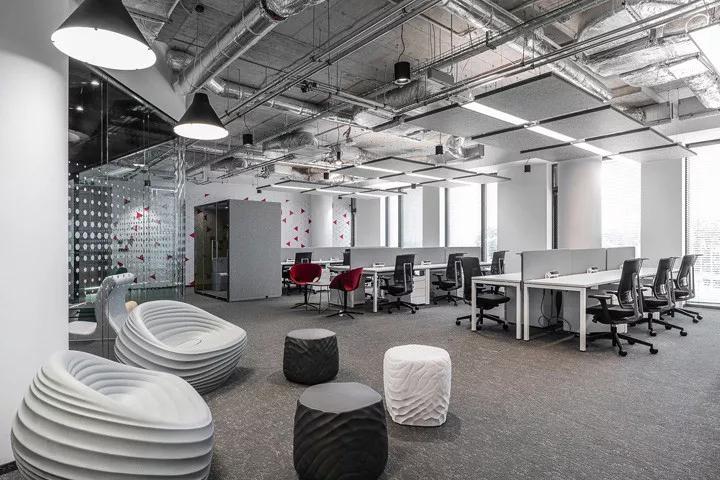 看上去这是一个很酷的科技感空间,但事实上,它的整体配色却极为精细、并具功能性、多元性。在单色工业风质感的开放区域,多种色彩点亮了空间,深圳装饰公司却仍保持着统一的美学基调。墙面上的红色几何造型、几件彩色家具、装饰木柱、软体家具,这些精致的配置足以让室内充满活力和朝气。