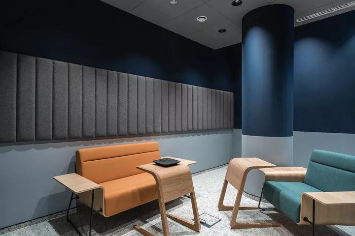 对于设计团队来说,房间声学设计至关重要。墙面上、照明上、工作台之间的声学板或其它声学系统可以有效控制工作场所的噪音。本案还有一个很有趣的元素就是办公和会休闲议之间的木柱隔断,其中一部分圆柱覆盖以特殊的吸音面料。同时面料的色彩与近旁的座椅相同,形成呼应。