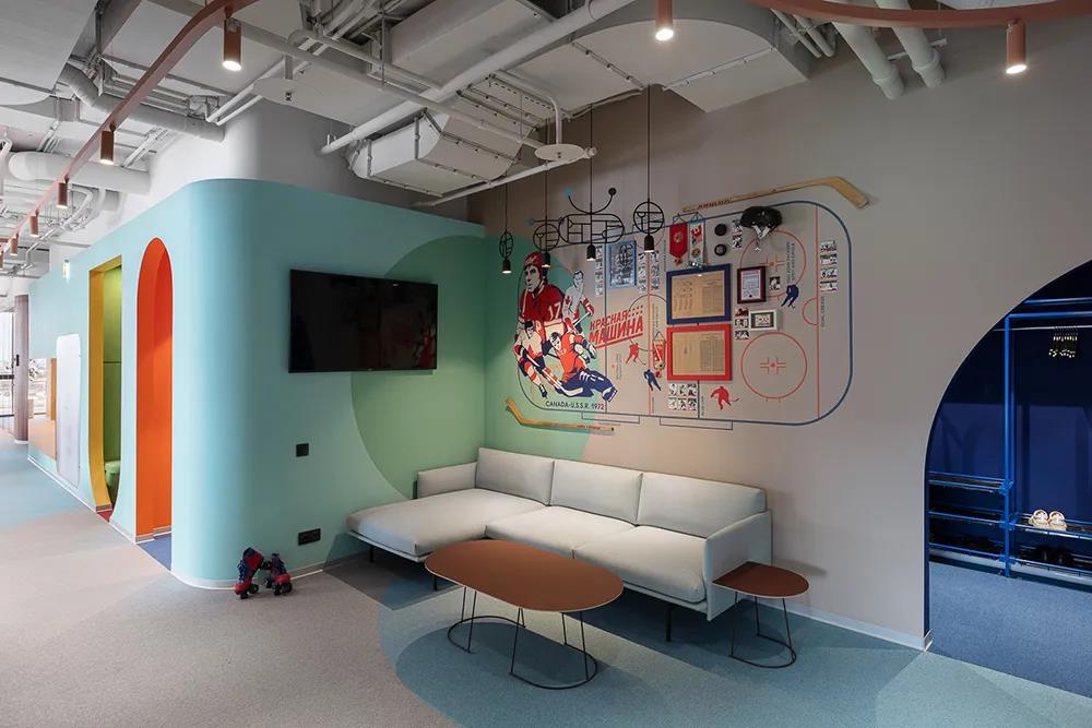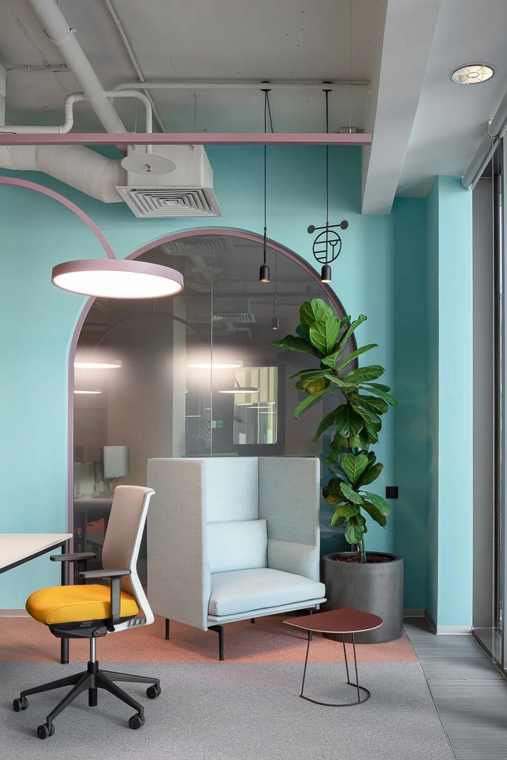 绿松石和浅粉色的宁静色彩组合与明亮的色彩相结合,呈现在会议室、家具、海报和平面设计中。公司的口号“努力工作-努力玩乐”是深圳装饰公司企业文化的关键原则之一。正是基于这一原则,企业文化才充满活力。该设计成功地将功能、技术和设计相结合,不仅创造了高效的工作环境,还兼顾了健康的活动、发展和正能量。