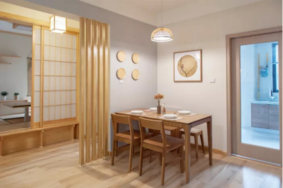 这是一套面积83㎡的小三居。女业主有留日经历,偏爱日式风格“小、巧、精”的理念。回国后,在一家投行任职,她钟情木质元素,酷爱生活。原木恰是自由的又充满生命气息,所以设计里大量运用了木元素,包括藤席、蒲扇这些原生态物件。让整个家在繁忙的都市背后,可以沉静下来,品味生活的美妙,回归自然的本我,营造一种诗意的生活。